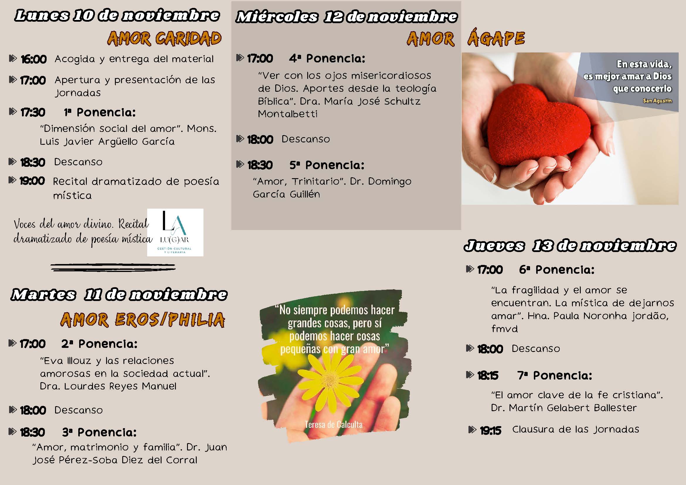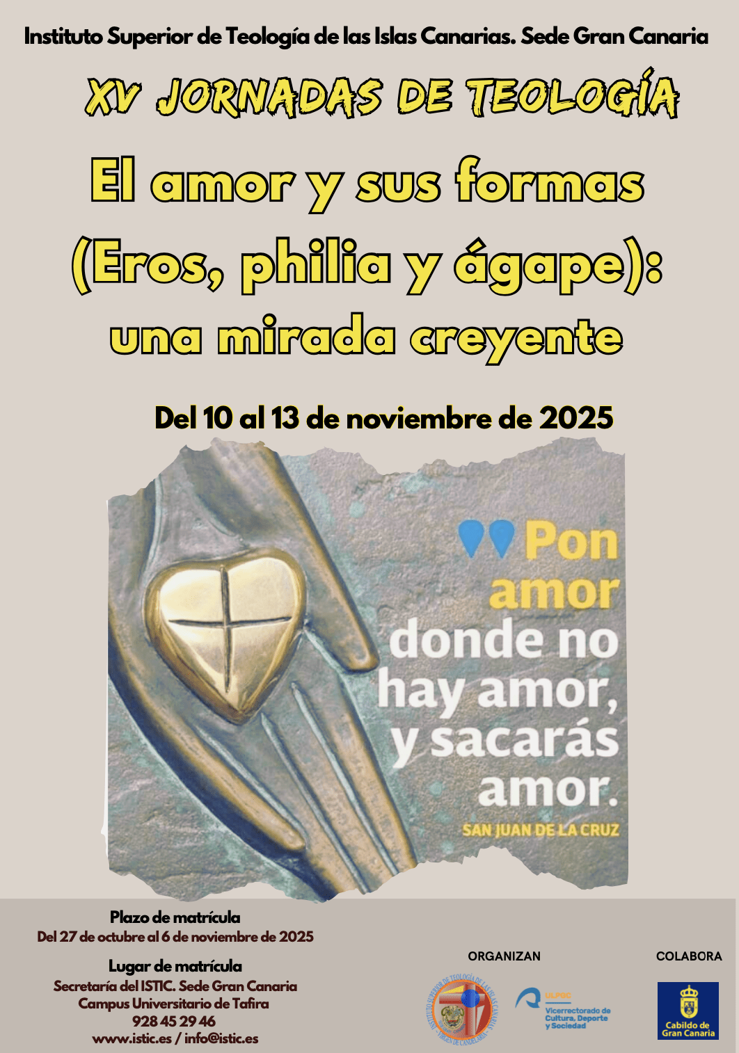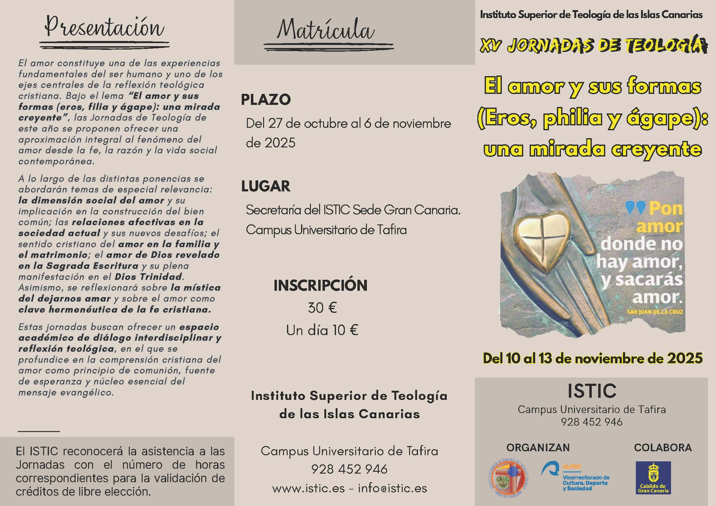 Del 10 al 13 de noviembre próximos se celebrarán en el Istic las XV Jornadas de Teología y versarán sobre el amor y sus formas. Estas Jornadas que llevan por título «El amor y sus formas: Eros, philia y ágape: una mirada creyente» cuentan con la participación de grandes figuras de la teología y la filosofía que supondrán el más importante evento de las humanidades en nuestro entorno. Aquí ofrecemos el cartel y el programa. Para más información contactar con el Istic: 928452946 o info@istic.es.